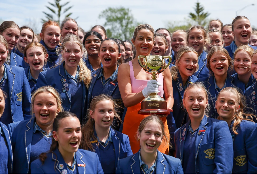Michelle Payne (Class of 2003) returned to Loreto College last week, accompanied by the Melbourne Cup and her horse, Prince of Penzance, as part of the Lexus Melbourne Cup Tour.